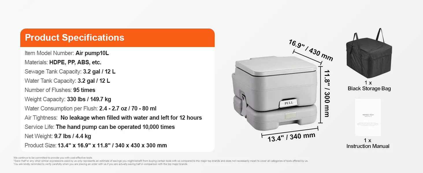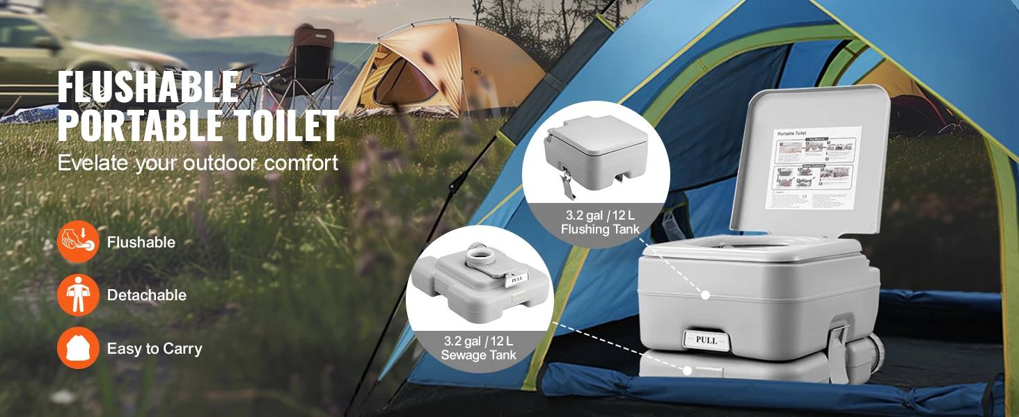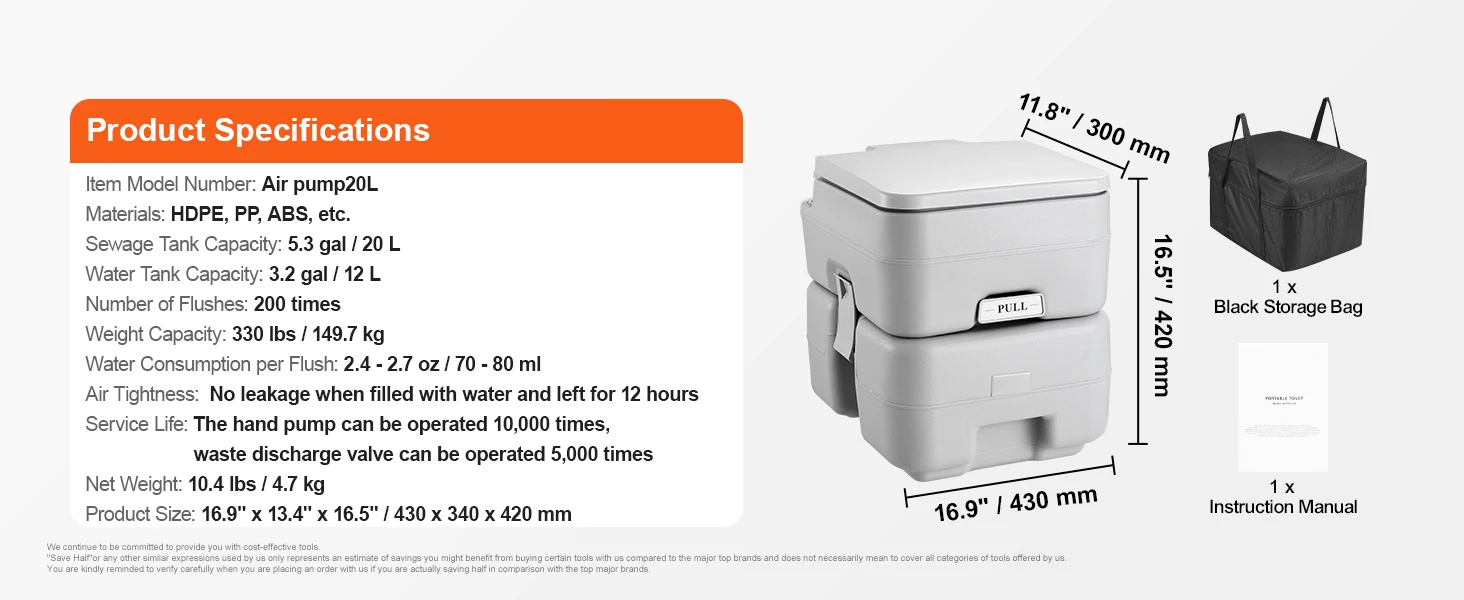 Portable Toilet with Flushing: No more frantic searches for the nearest restroom while camping or traveling! This compact, fully-featured toilet allows you to enjoy nature and your journey worry-free. Equipped with detachable waste and flush tanks, it measures only 16.9" x 13.4" x 11.8" / 430 x 340 x 300 mm when assembled. Once securely fixed in place, its stable structure can support up to 330 lbs / 149.7 kg without deformation.