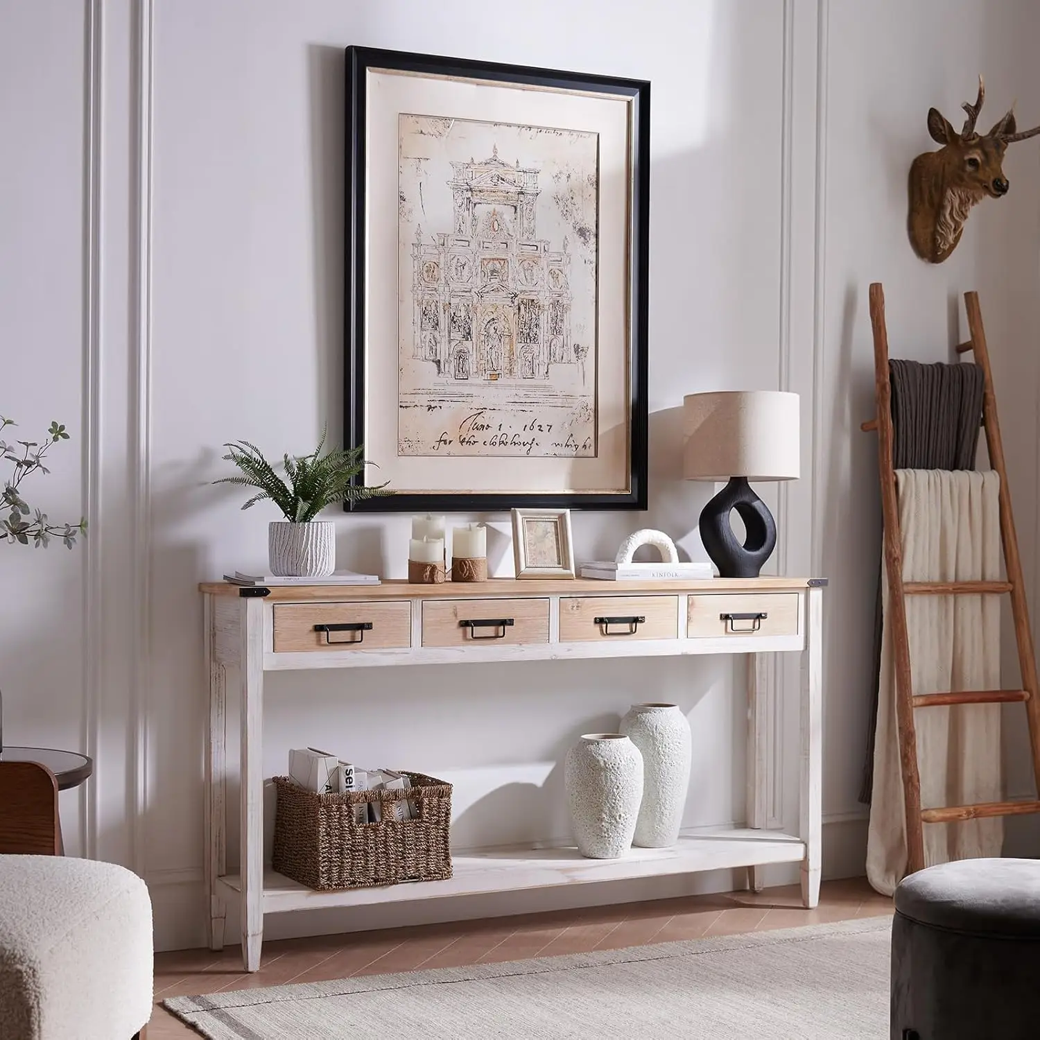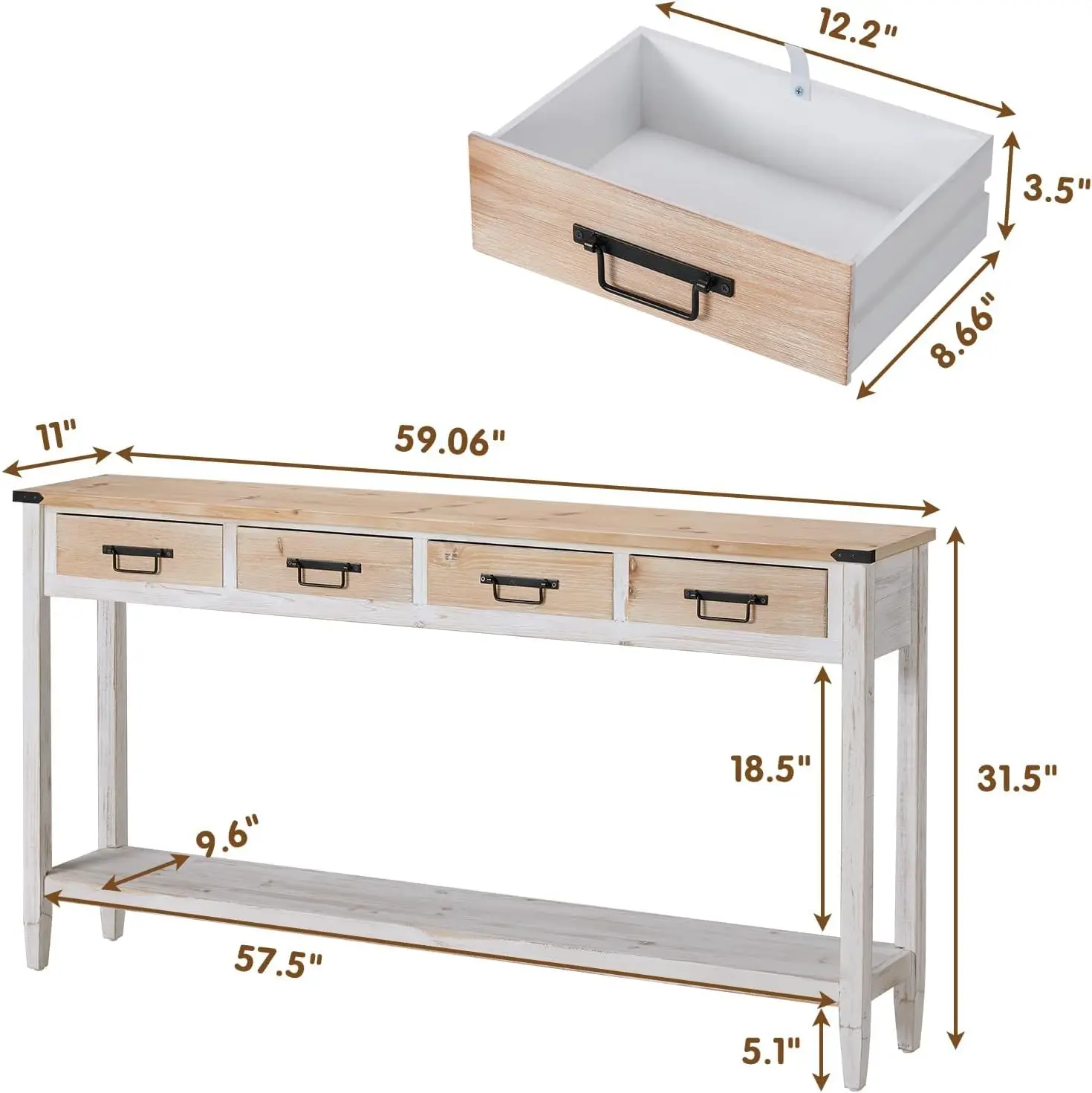 - 【Elegant and Sturdy Structure Design】 - This console is handmad. The table is made of artificial wood and the top table top is vintage textured bark finish. The table has drawers and two open storage shelves at the bottom for storage, and the black metal handle is simple and elegant.