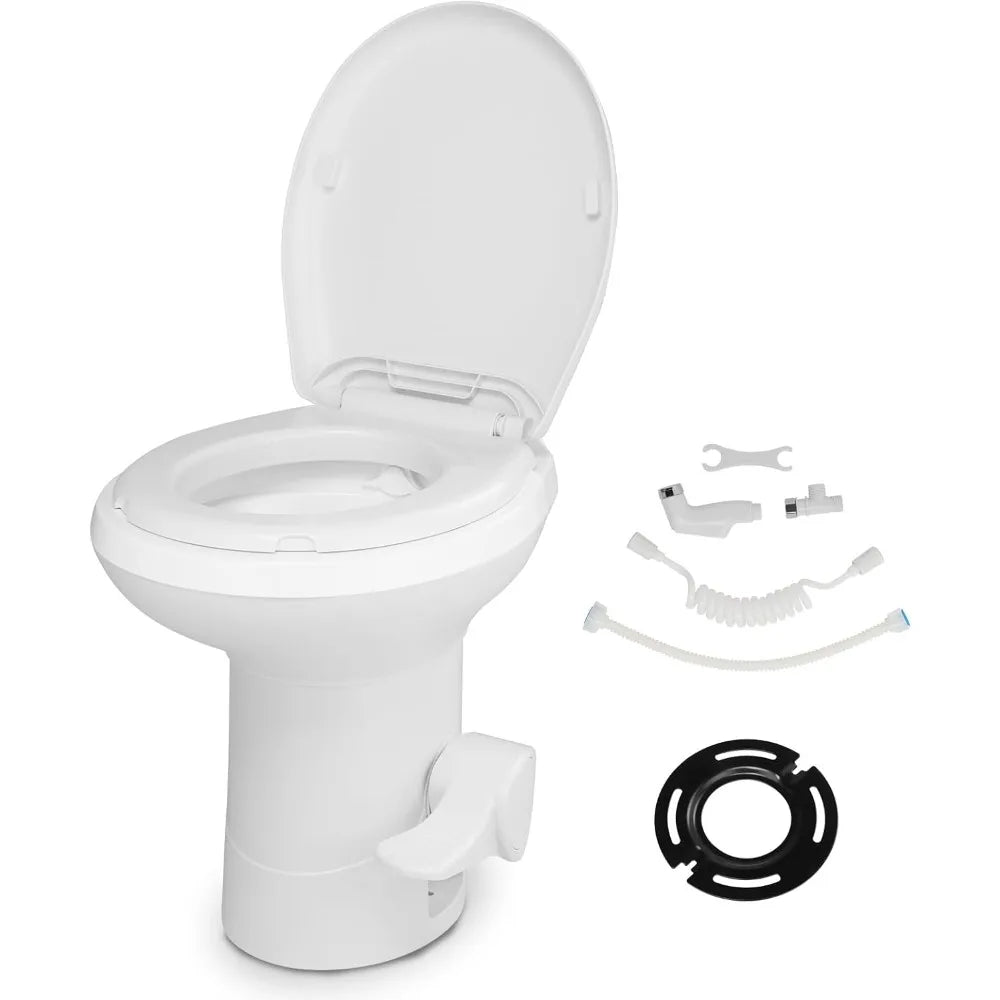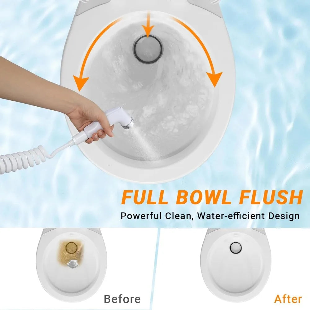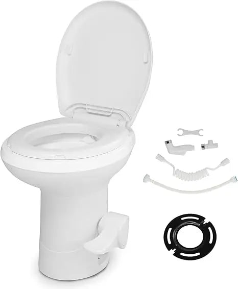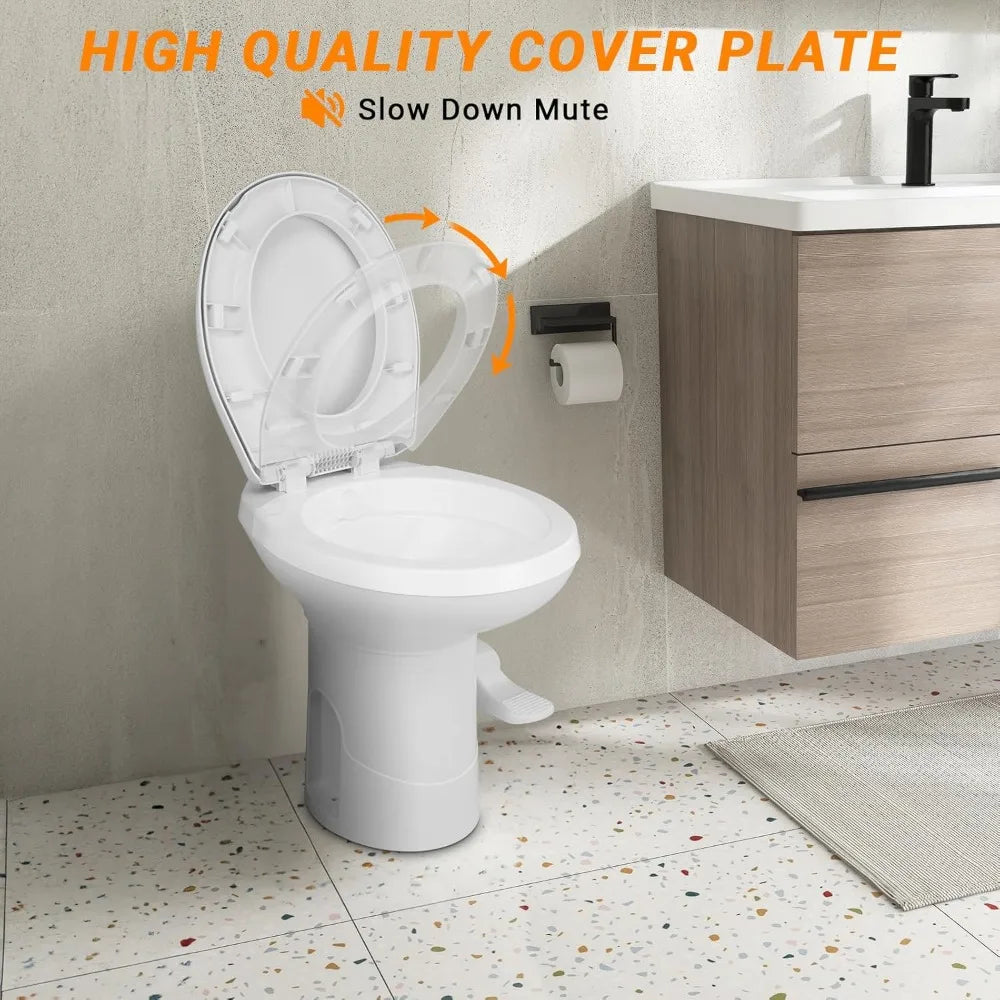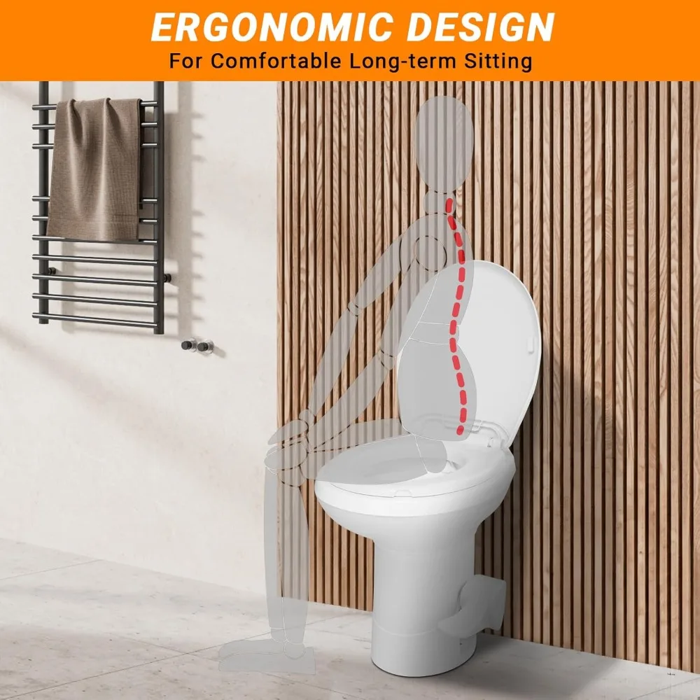 This product features a bowl crafted from a combination of high-density polyethylene (HDPE) and polypropylene (PP), ensuring it is both lightweight and durable. The design of the bowl is thoughtfully engineered to prevent water from splashing back. It also includes a soft close mechanism that prevents the lid from slamming shut. The full-size seat measures 17.5 inches, providing a comfortable seating experience. The flushing system is operated by a pedal, with a half press adding water and a full press initiating the flush.