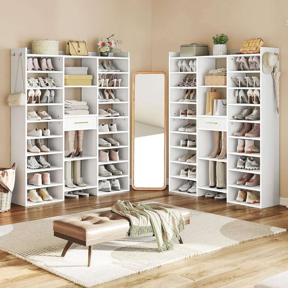 Diverse Storage Options: This tall shoe cabinet has a fenced top for safely placing albums or decorations and a non-woven fabric drawer in the middle for conveniently storing small items. Four double-ear hangers help organize bags, hats and keys