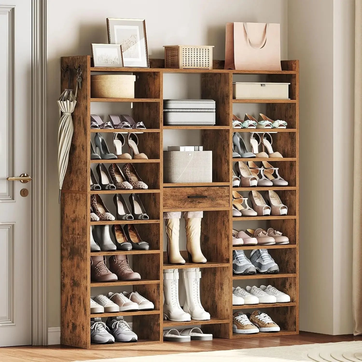 Sleek and Versatile: The rustic brown wood-grain finish of this wooden shoe cabinet organizer is simple and elegant, matching a variety of home decor styles. Suitable for entryways, foyers, and closets, this shoe rack boosts storage while enhancing visual appeal