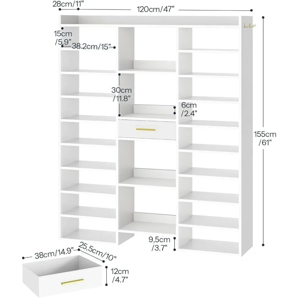 10-Tier High Capacity: This 10 tier shoe rack, measuring 47"L x 11"W x 61"H, can hold 25 to 33 pairs of shoes. It features compartments of 5.9"H and 11.8"H, accommodating both flat and high-heeled shoes