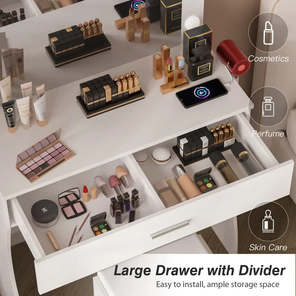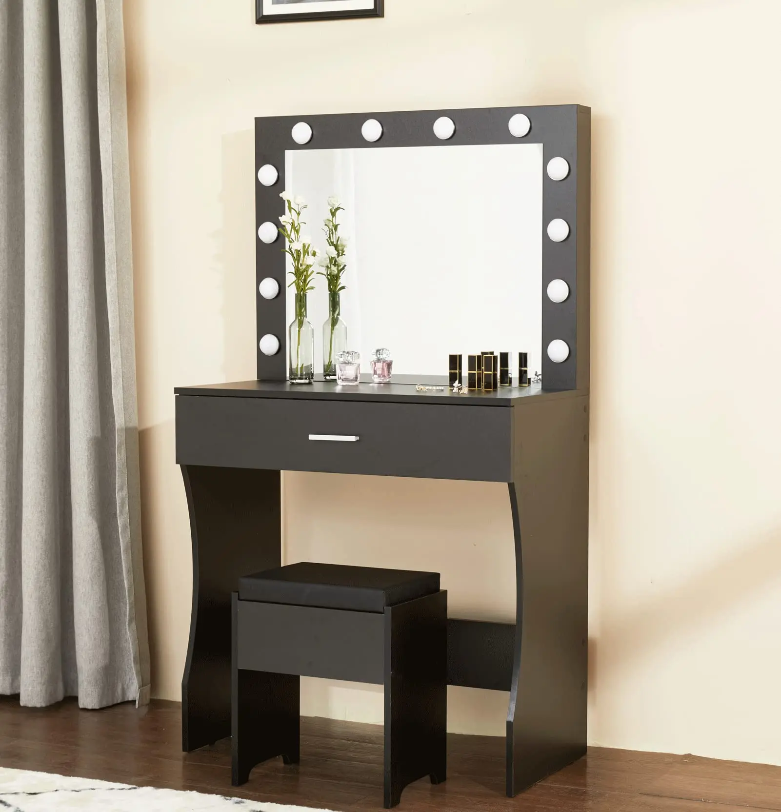 This vanity set features a large drawer with divider,a spacious desktop,and a storage stool. It allow that all of your items can be placed in categories. And even you have some personal items or large hair dryer and other items,there are also have a storage stool to provide a space for you storing