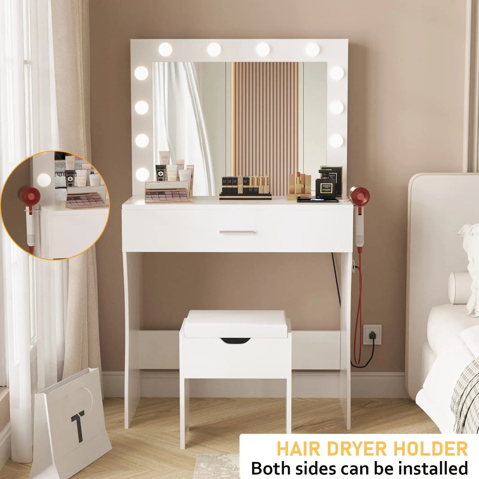 There are two styles of this vanity table,come with power outlet or without power outlet. You can choose any of them accroding to your makeup needs. If you choose the vanity set with charging station,then it will equipped with 2 standard power outlets,2 USB ports,and a hair dryer rack,very convenient for your hair dryer or other beauty electronic devices charging