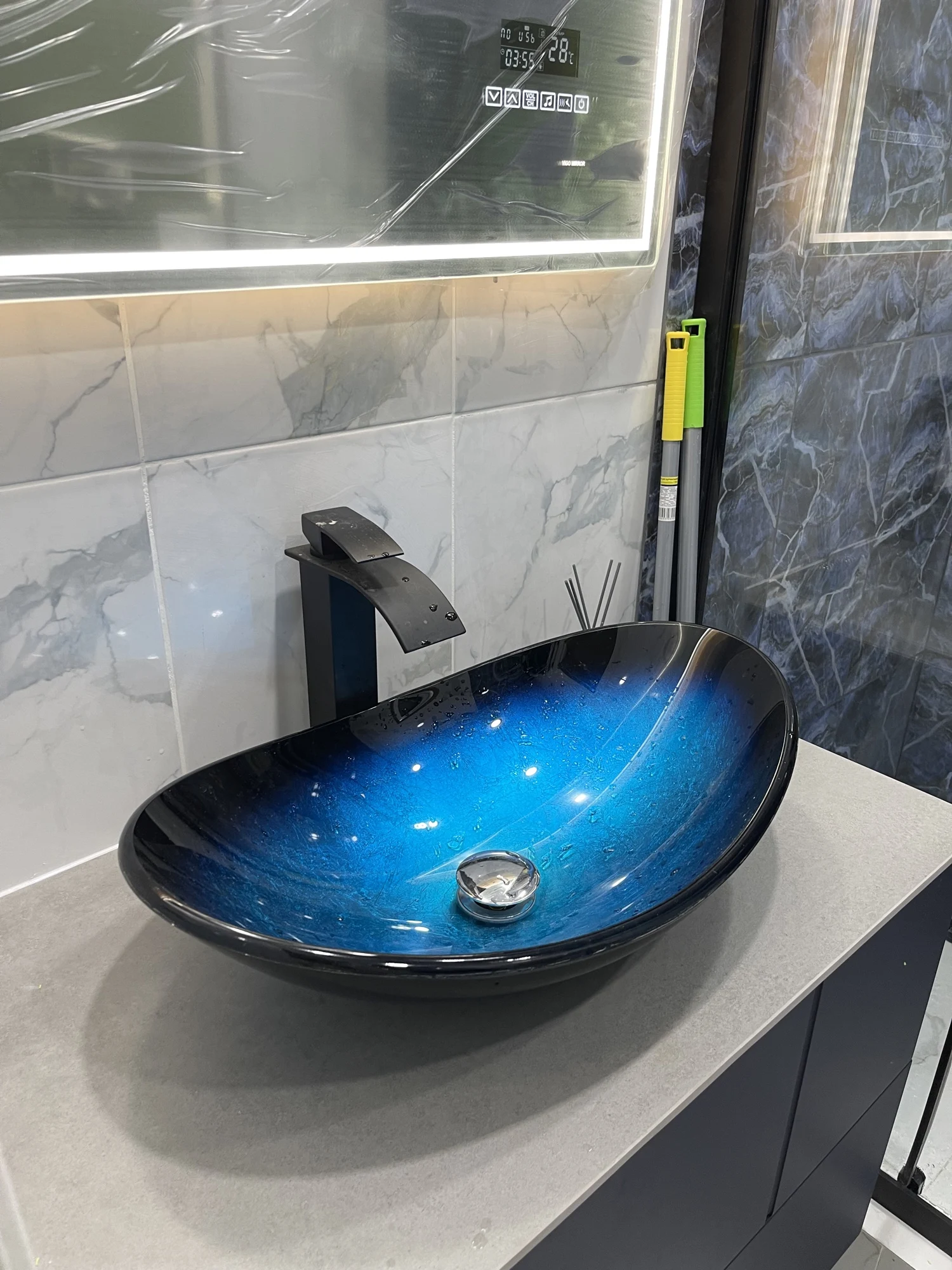 Versatile Installation: Designed for countertop installation, this blue glass basin and matching faucet set is perfect for bathroom vanities, stylish bar areas, or as a unique bathroom sink, elevating the aesthetics of any space.