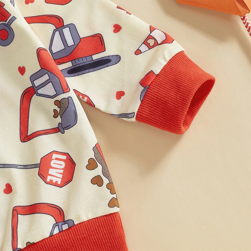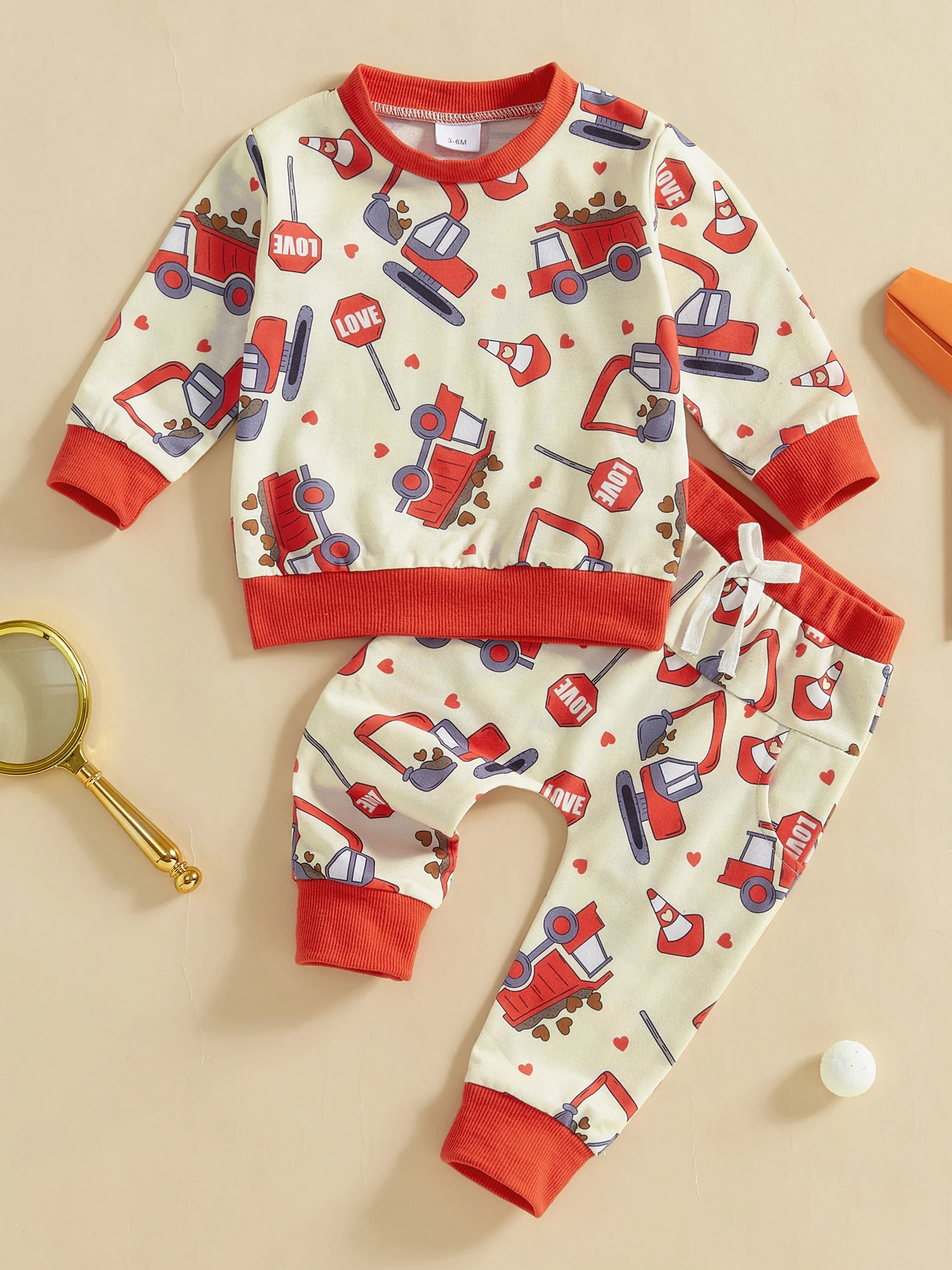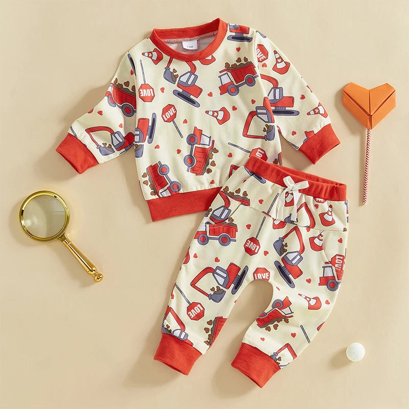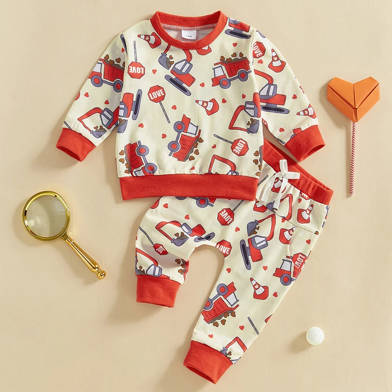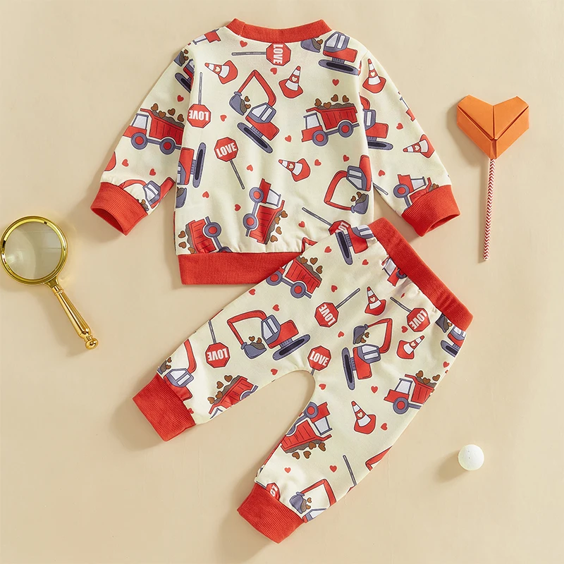 Boy Valentine's Day outfit with truck print, warm and cozy; Boy sweatshirt with crew neck and long sleeve design; Baby boy pants with side pockets and elastic waist design to ensure a comfortable fit, perfect for fall wear