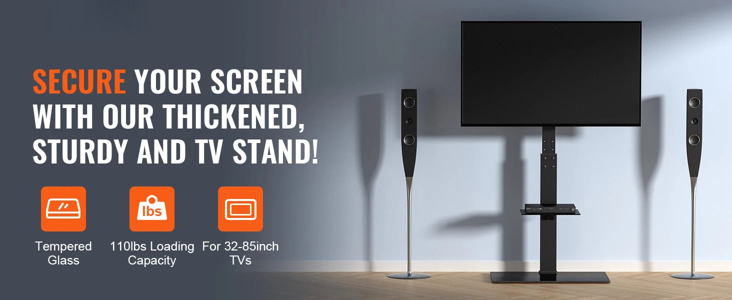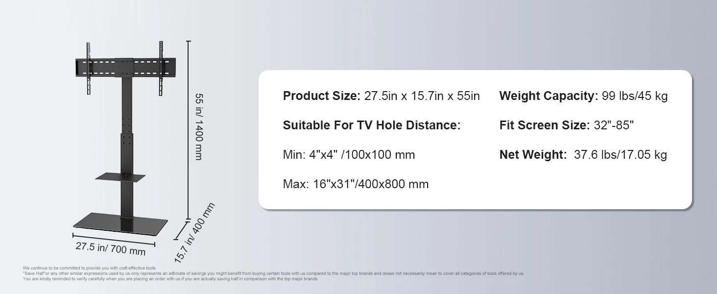 Universal Compatibility: Designed to accommodate your needs, our TV stand mount fits 32-85 inch TVs with a weight capacity of up to 99 lbs. The VESA ranges from 100mm x 100mm to 400x800 mm, making it compatible with most brands of TVs.