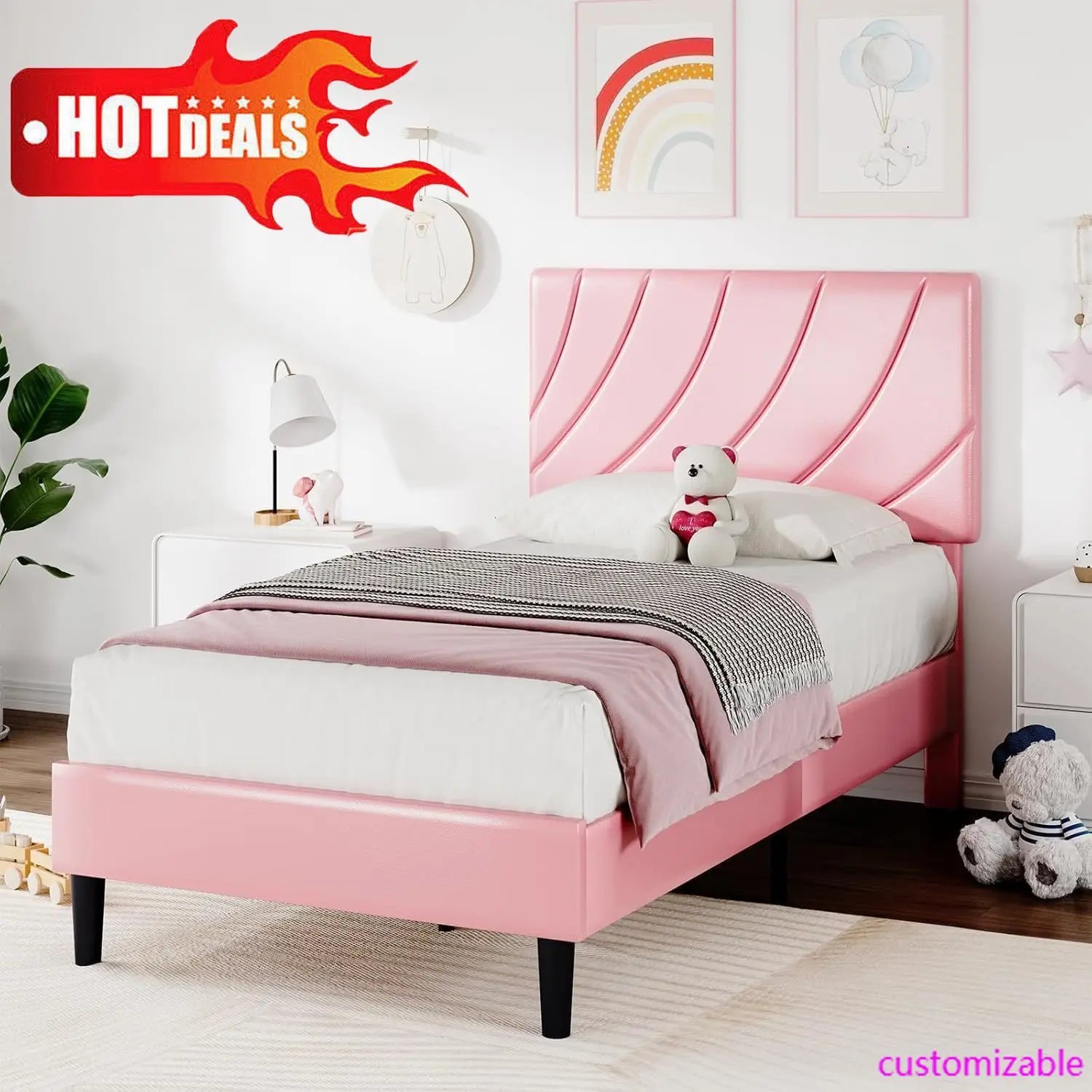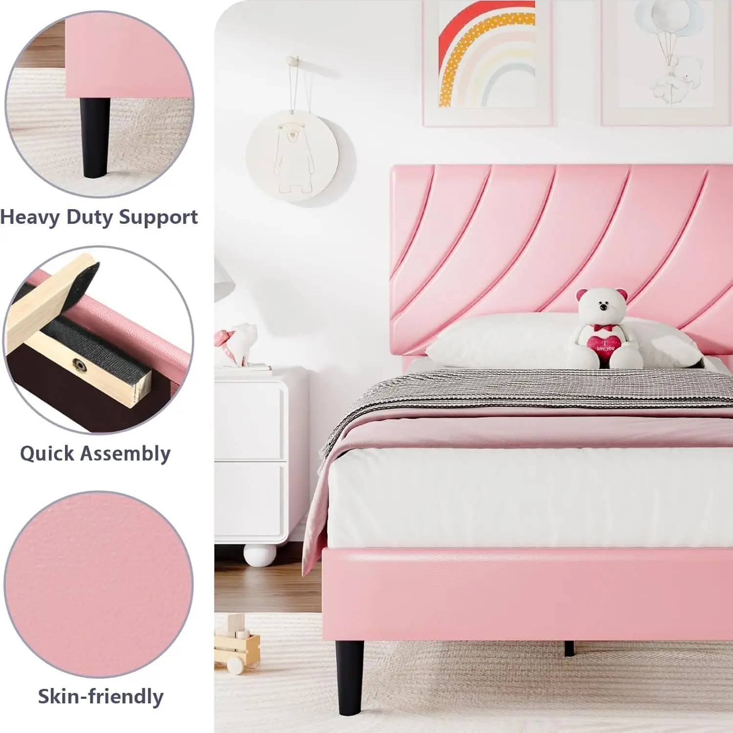 - Pink Modern Elegant Bed: Featuring premium faux leather and a modern headboard design, this twin bed frame for girls will blend perfectly into any bedroom decor, adding a touch of elegance and comfort to your space