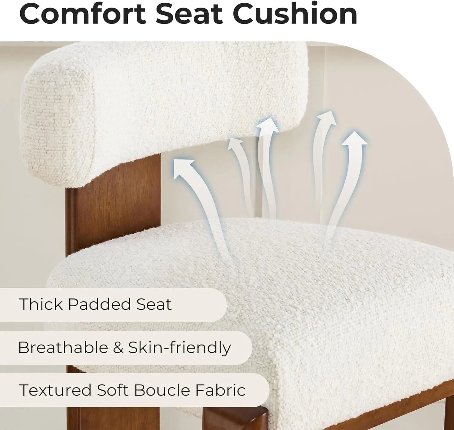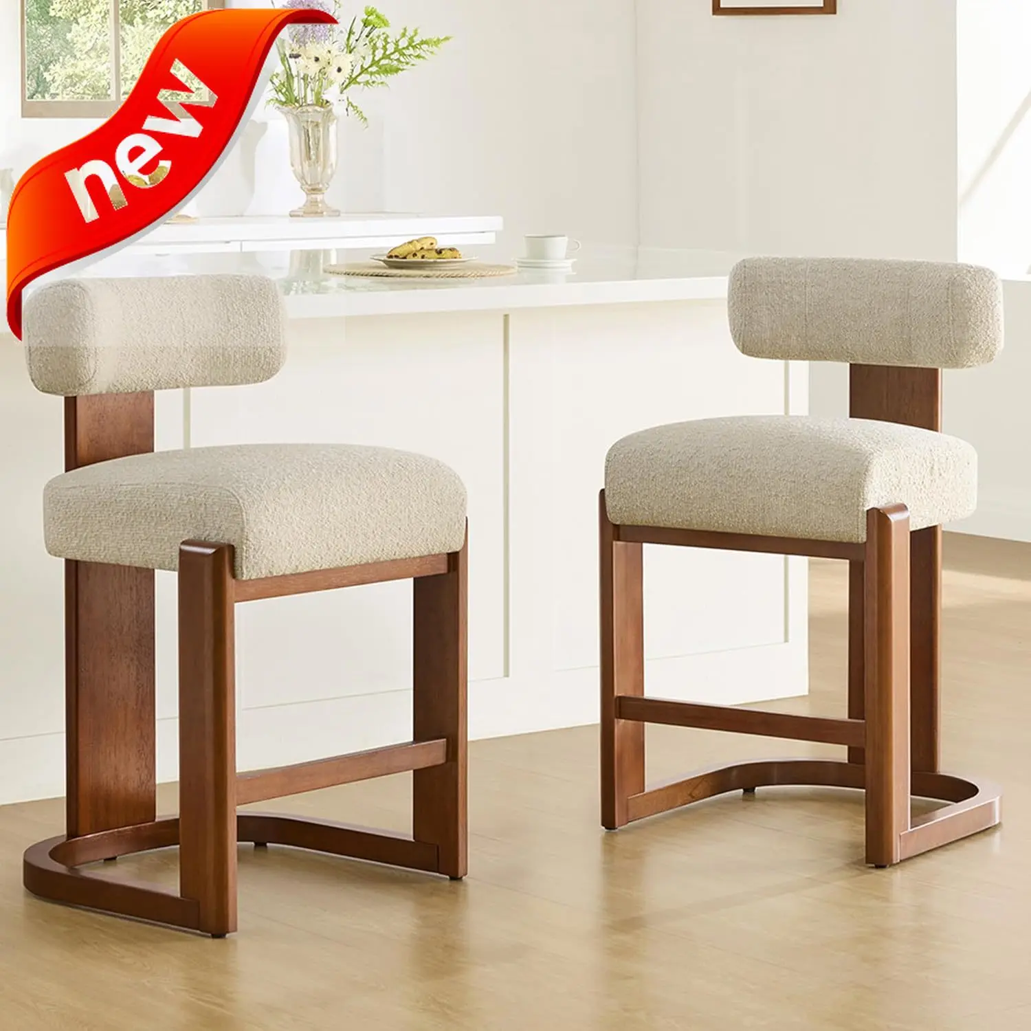 - Modern & Unique Counter Stools: The modern bar stools feature a sleek, natural design with solid wood frames and boucle-textured upholstery. The sculpted U-shaped base and low-profile backrest add visual appeal and ergonomic support—ideal for any kitchen, island, or dining space.