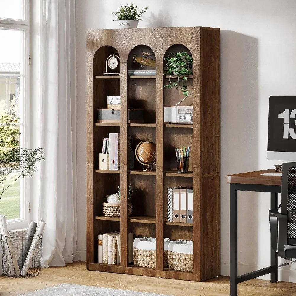 - Charming Vintage Design: Transform your space with the rustic farmhouse bookshelf that features a vintage brown wood grain and arched detailing. It blends timeless charm with practical storage, adding a touch of mystery and elegance to any room