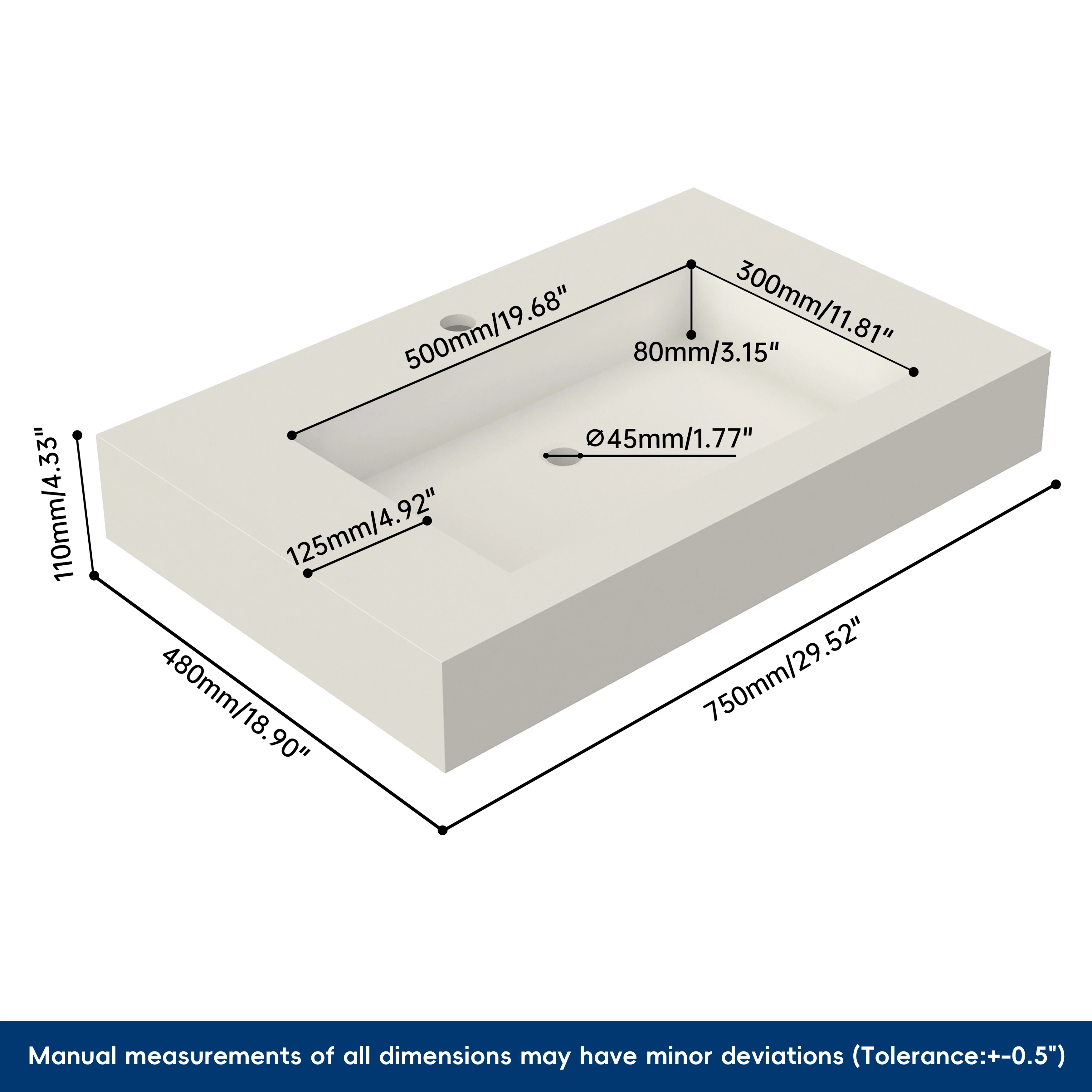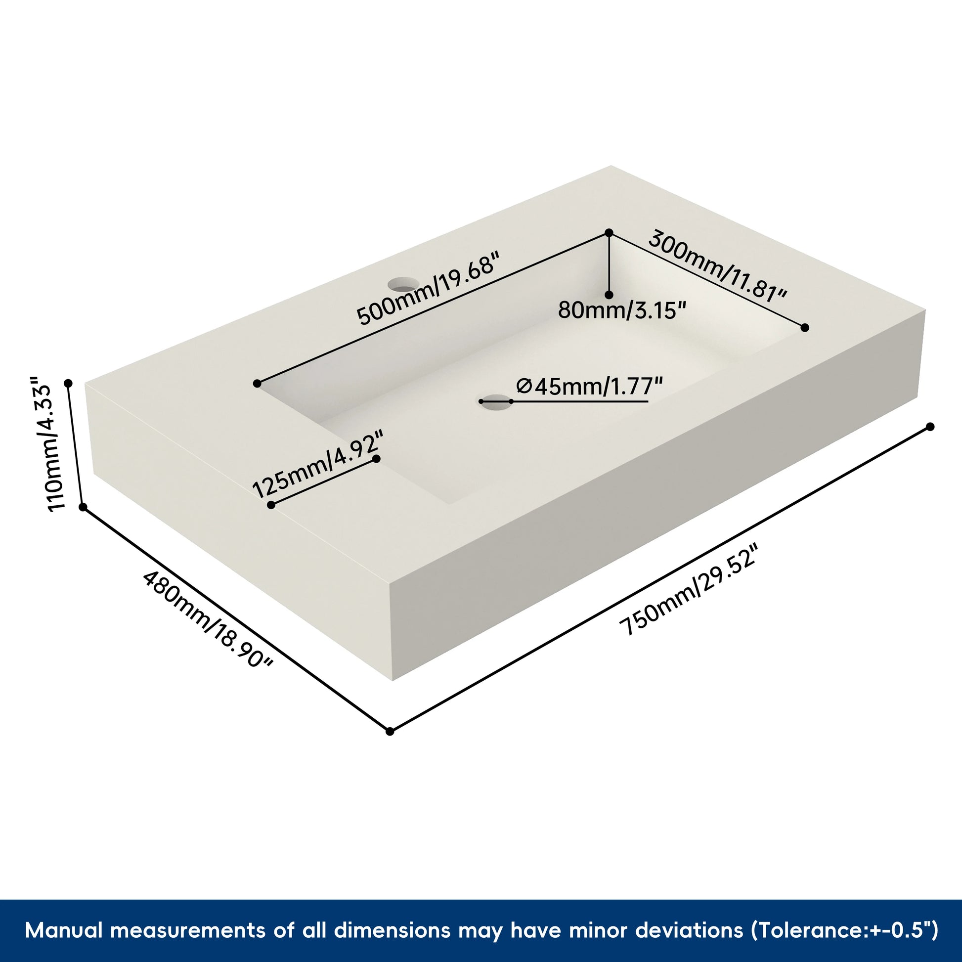 Sleek and Seamless Design: The MEDUNJESS 30" X18.9" X4.33" , Stone Resin Wall Mounted Floating Sink features a unique wall-mounted design that adds a sleek and seamless appearance to your bathroom. This modern and contemporary sink is the perfect choice for those with minimalist aesthetics or compact bathrooms, as it frees up valuable floor space