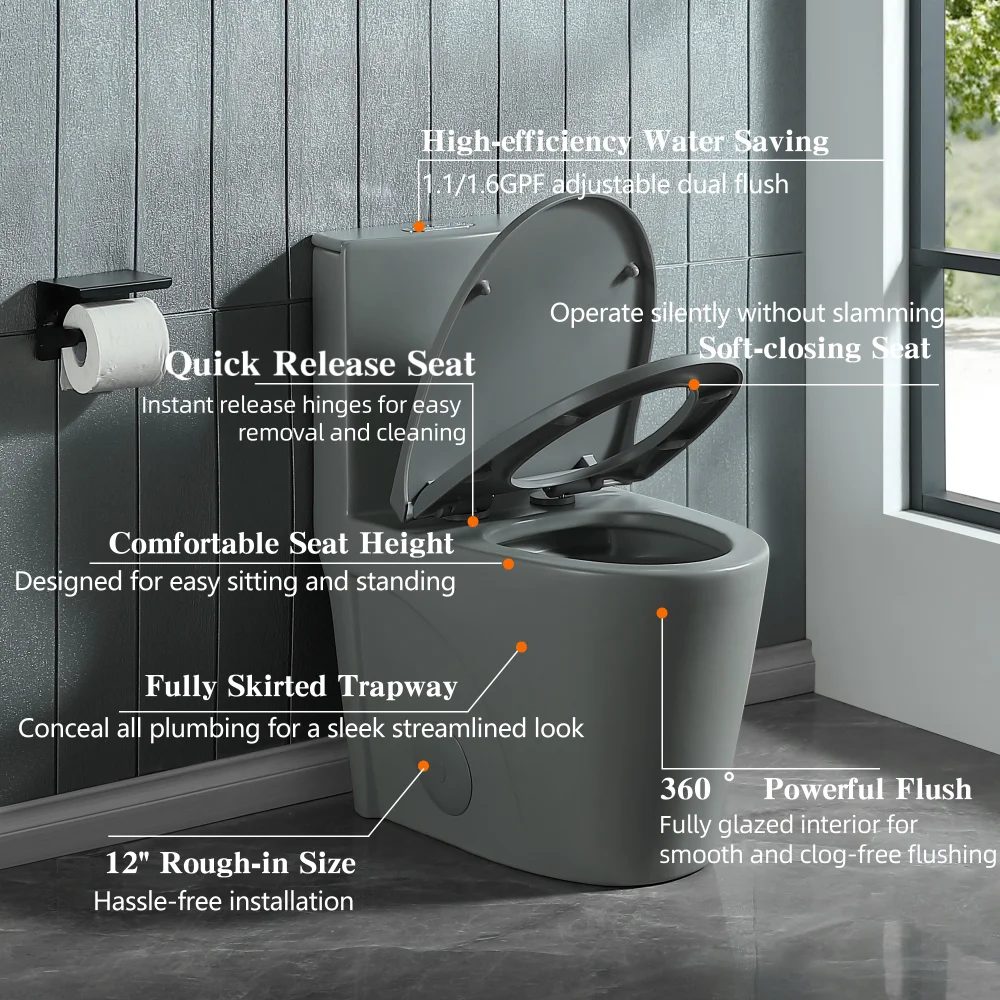 - Sleek One-Piece Design: With its seamless construction, this toilet eliminates the need for a separate tank and bowl. Not only does it enhance the aesthetics of your bathroom, but it also simplifies cleaning. Say goodbye to crevices and hard-to-reach areas, making maintenance easier and ensuring a more hygienic experience.