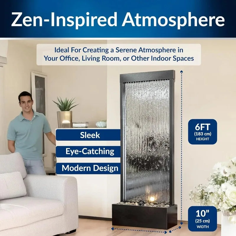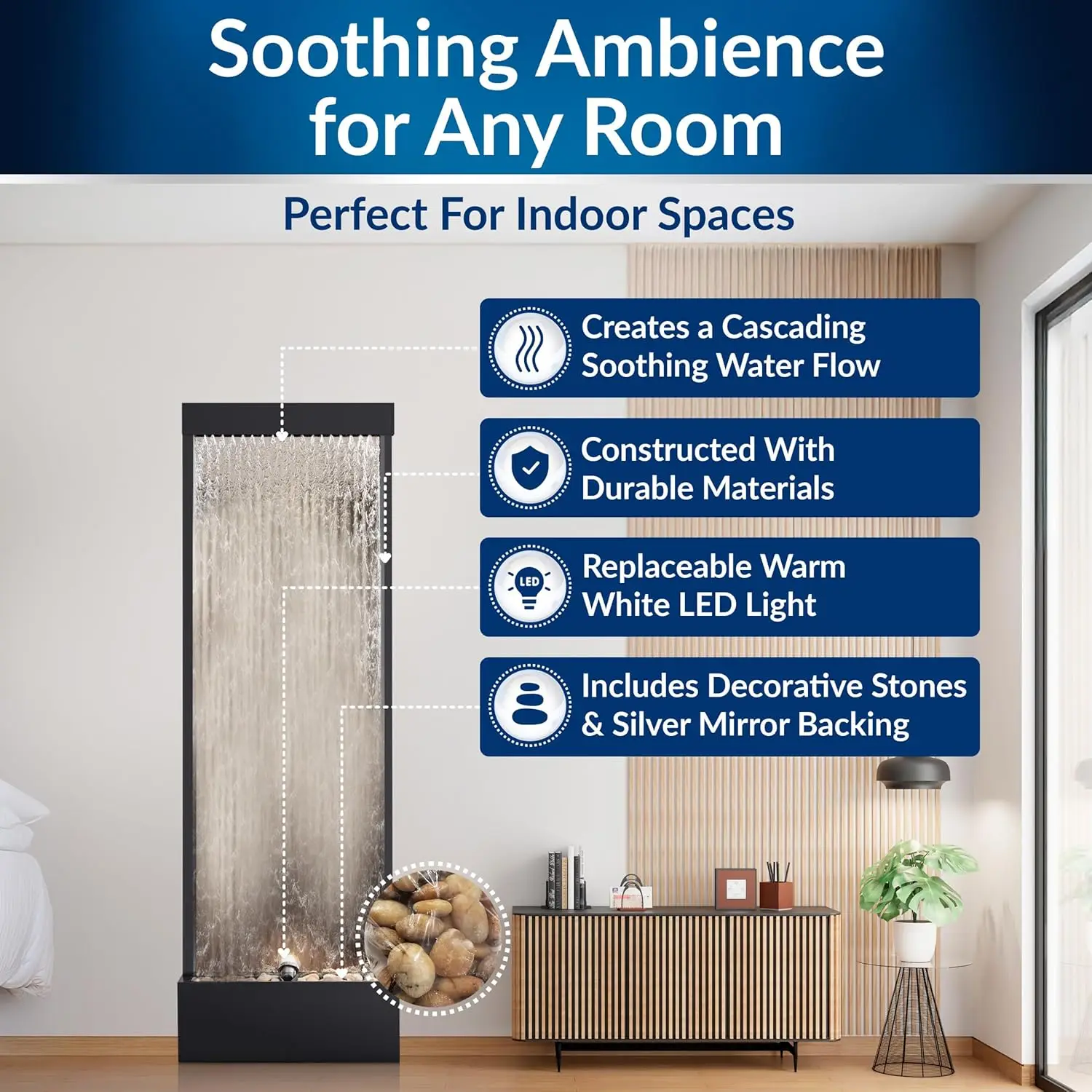 Mirror Waterfall Fountain with Stones and Lights - Zen Indoor/Outdoor Decor for Office, Living Room, Patio, Entryway - 72 Inches