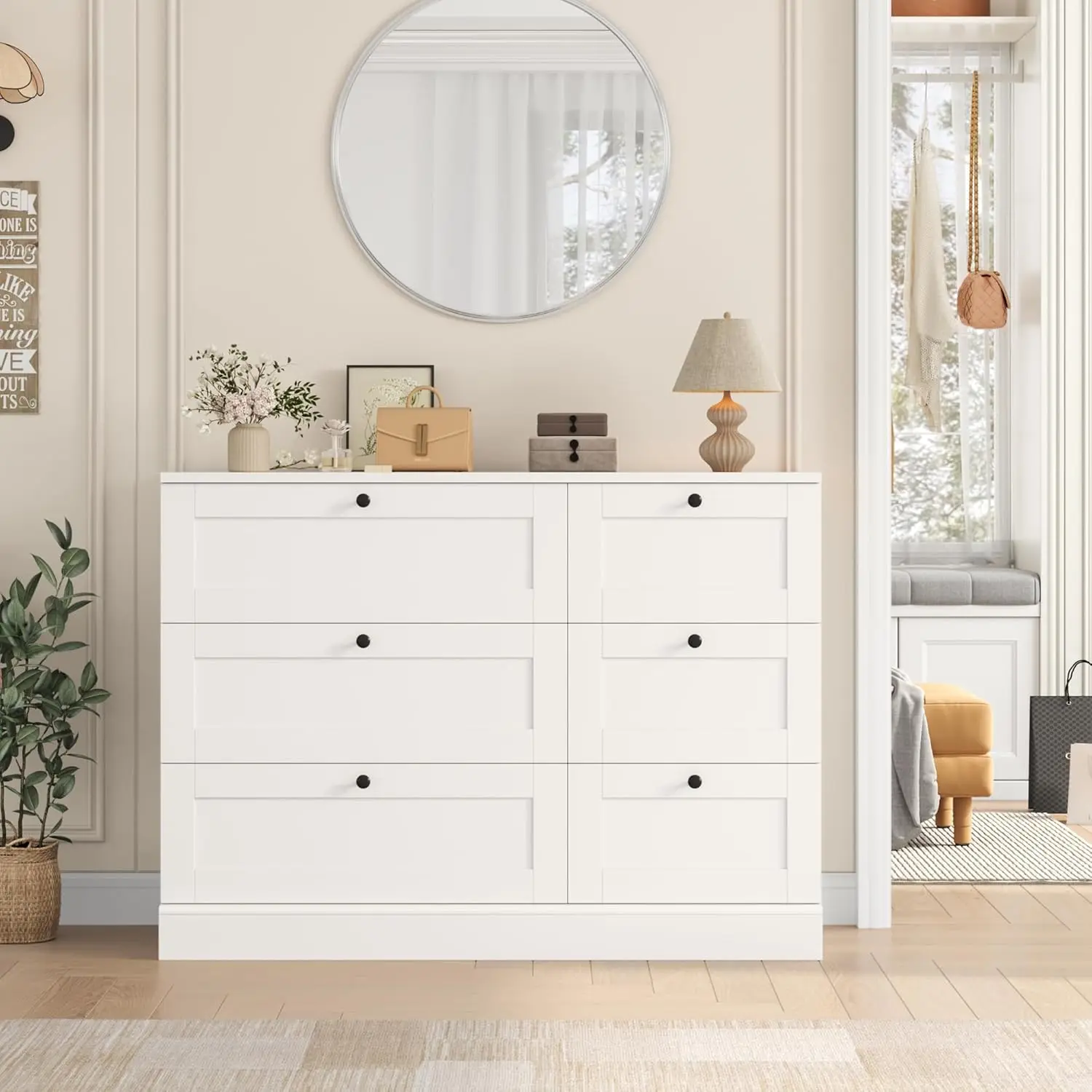 6 Drawer Dresser, White Dresser for Bedroom, Wood Wide Chest of Drawers, Modern Drawer Chest for Living Room, Entryway, Hallway, White