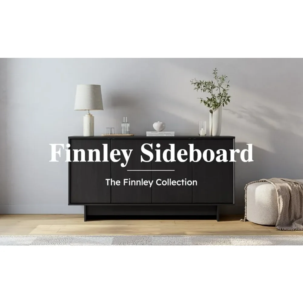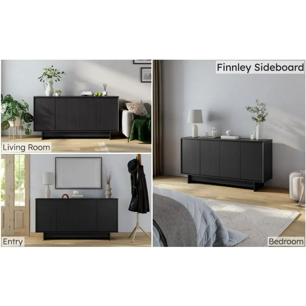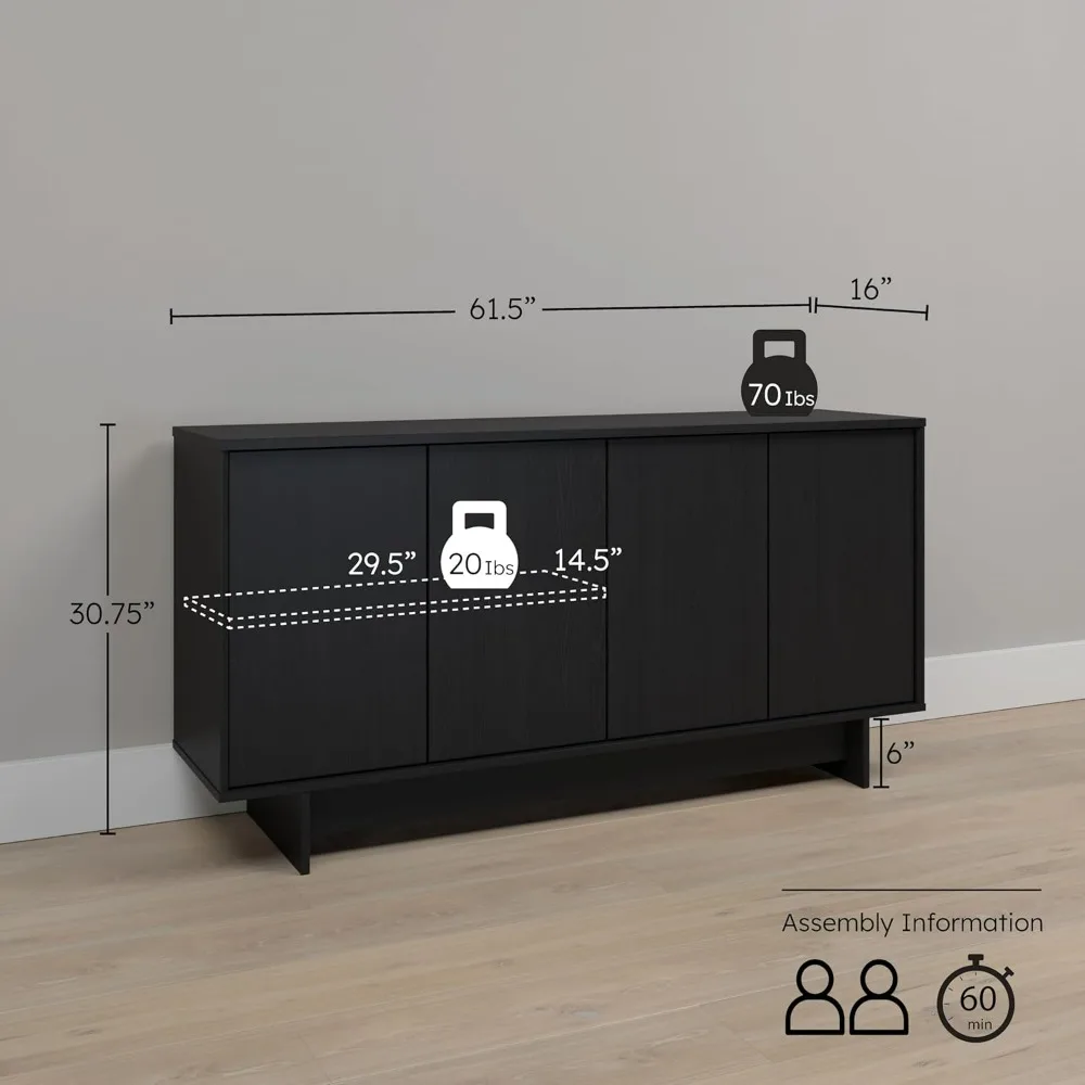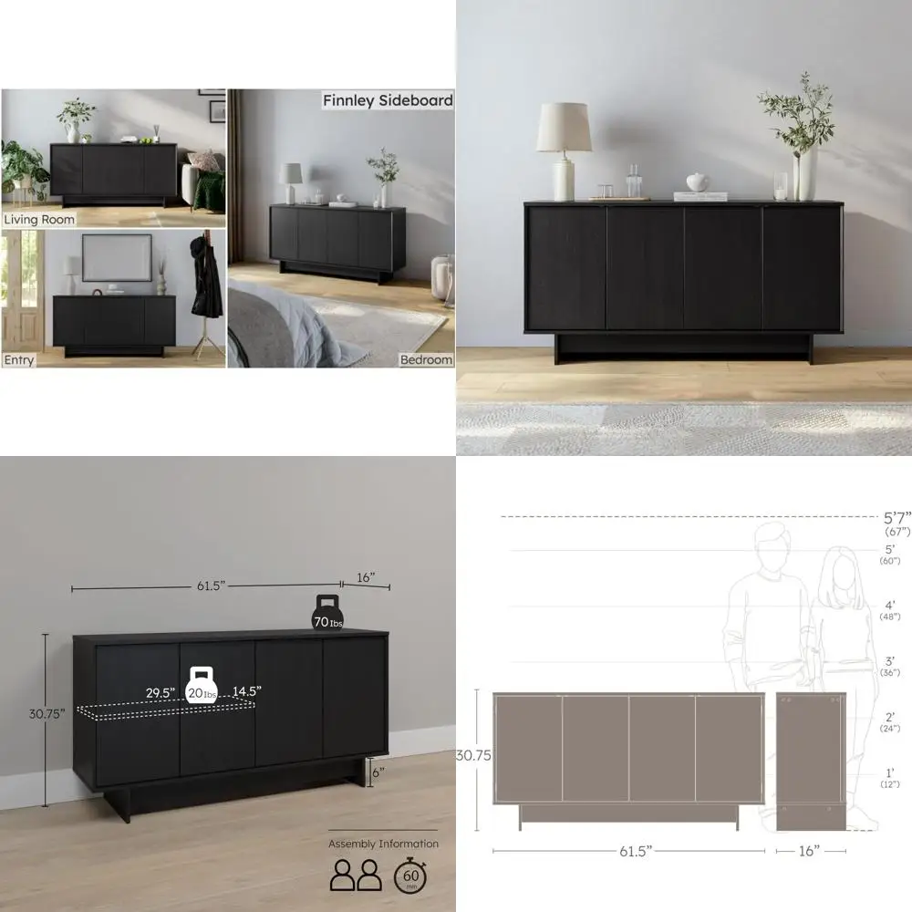 This product description highlights the Finnley Black Oak Sideboard, a versatile and stylish piece of furniture designed for multi-room use. With assembled dimensions of 16"D x 61.5"W x 30.75"H and a total weight of 115.00 lbs, this sideboard arrives in one box ready to assemble. Proudly designed and made in North America, it ensures trusted quality and reliability, supported by a knowledgeable customer service team. The Finnley Black Oak Sideboard is perfect for Scandinavian furniture enthusiasts, as it can transition seamlessly from an entryway cabinet to a dining room buffet or a modern TV console. It offers customizable storage options with two adjustable shelves inside, allowing you to organize your belongings according to your needs, whether for media storage in the living room or dinnerware in the dining room. Equipped with 6-way adjustable Euro hinges, the sideboard provides smooth and flexible door alignment for easy access to your items, enhancing the user experience while maintaining a sleek look. The clean and modern aesthetic is complemented by a hardware-less closure system using a push latch, offering both style and practicality while keeping your essentials discreetly stored. Constructed from non-toxic, CARB 2 Compliant laminated composite woods with a sturdy medium-density fiberboard backer, the Finnley Black Oak sideboard is durable for long-term use, easy to clean, and environmentally friendly. Additionally, the product is backed by a 5-year limited warranty, ensuring a hassle-free shopping experience with fast customer service and replacement parts if needed. Assembly is easy, with detailed, step-by-step instructions and all necessary parts included, typically taking 60 minutes or less with basic hand tools by two people.